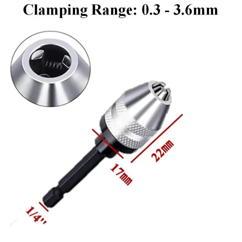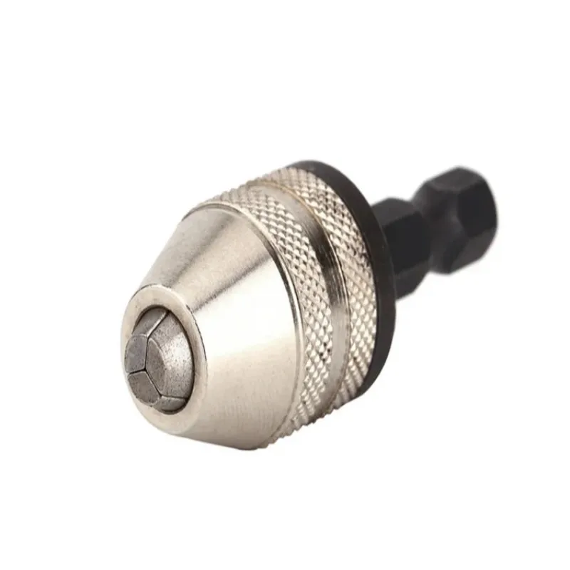 The 0.3-8mm quick change hexagonal shank three jaw self-tighten electric drill bits collet fixture is designed for efficient and secure drilling. It features a 1/4″ hex shank for compatibility with various electric drills.