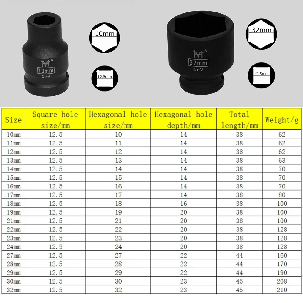- Socket sizes: 10mm, 12mm, 13mm, 14mm, 16mm, 17mm, 18mm, 19mm, 21mm, 24mm, 27mm, 30mm, 32mm