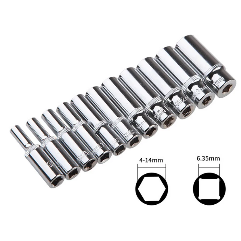 - Deep Sockets: 4mm, 5mm, 6mm, 7mm, 8mm, 9mm, 10mm, 11mm, 12mm, 13mm, 14mm