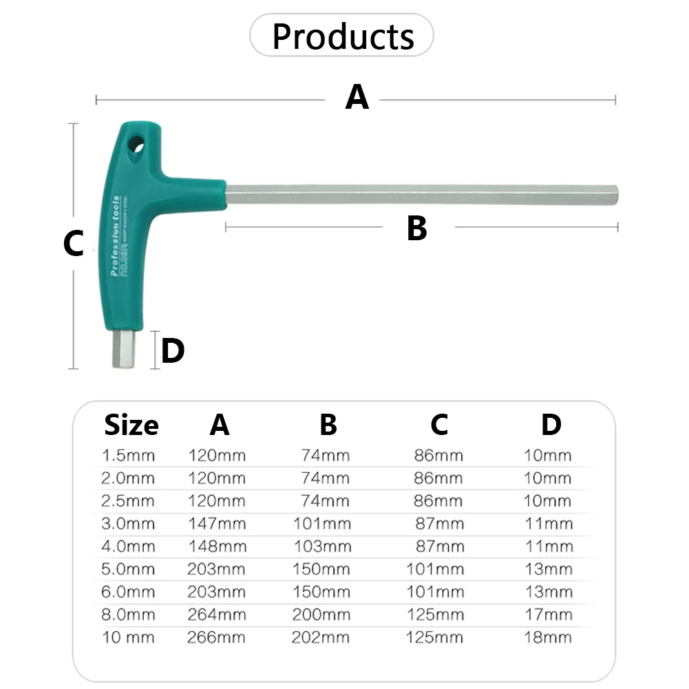 This T-Type Hex Key Allen Wrench Set is designed for efficient use in bicycle, motorcycle, and car repairs. Made from durable CRV material, it features a rubber handle for a comfortable grip and enhanced torque performance.