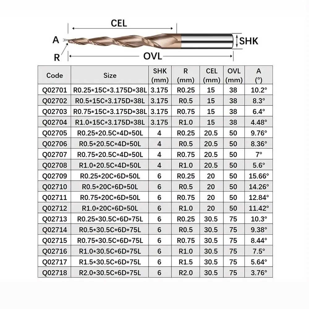 This high-quality end mill is designed for precision milling and engraving. It features a tapered ball nose design, making it suitable for various materials including stainless steel, cast iron, copper, aluminum, and hardwood.