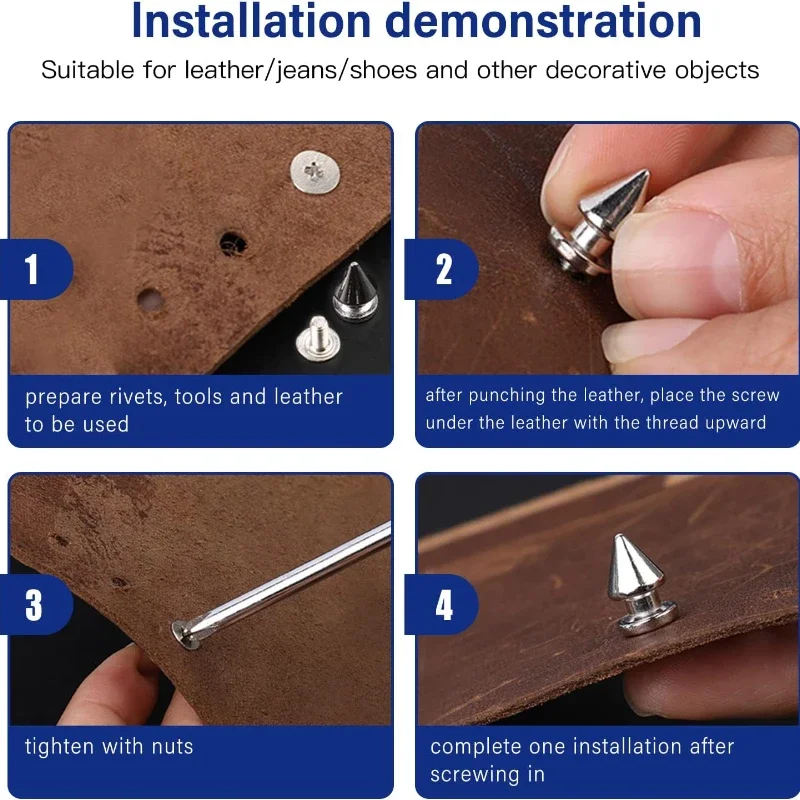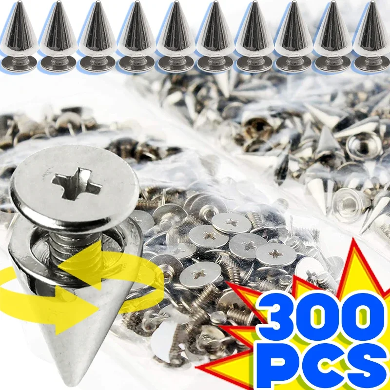 These 10-300Pcs Round Cone Spikes are metal screwback studs designed for DIY handcraft projects. Perfect for adding a cool punk aesthetic to garments, shoes, and various accessories.