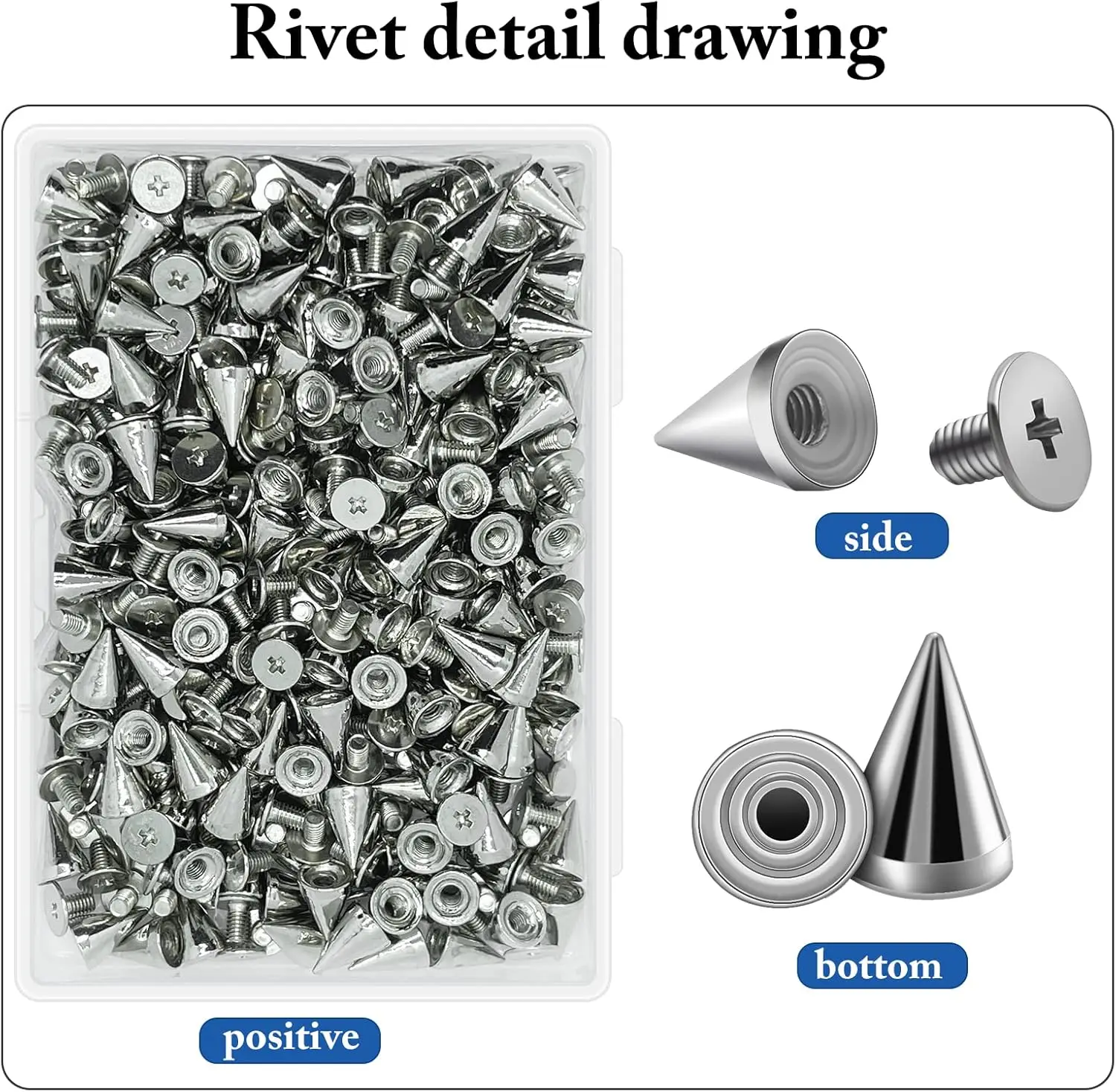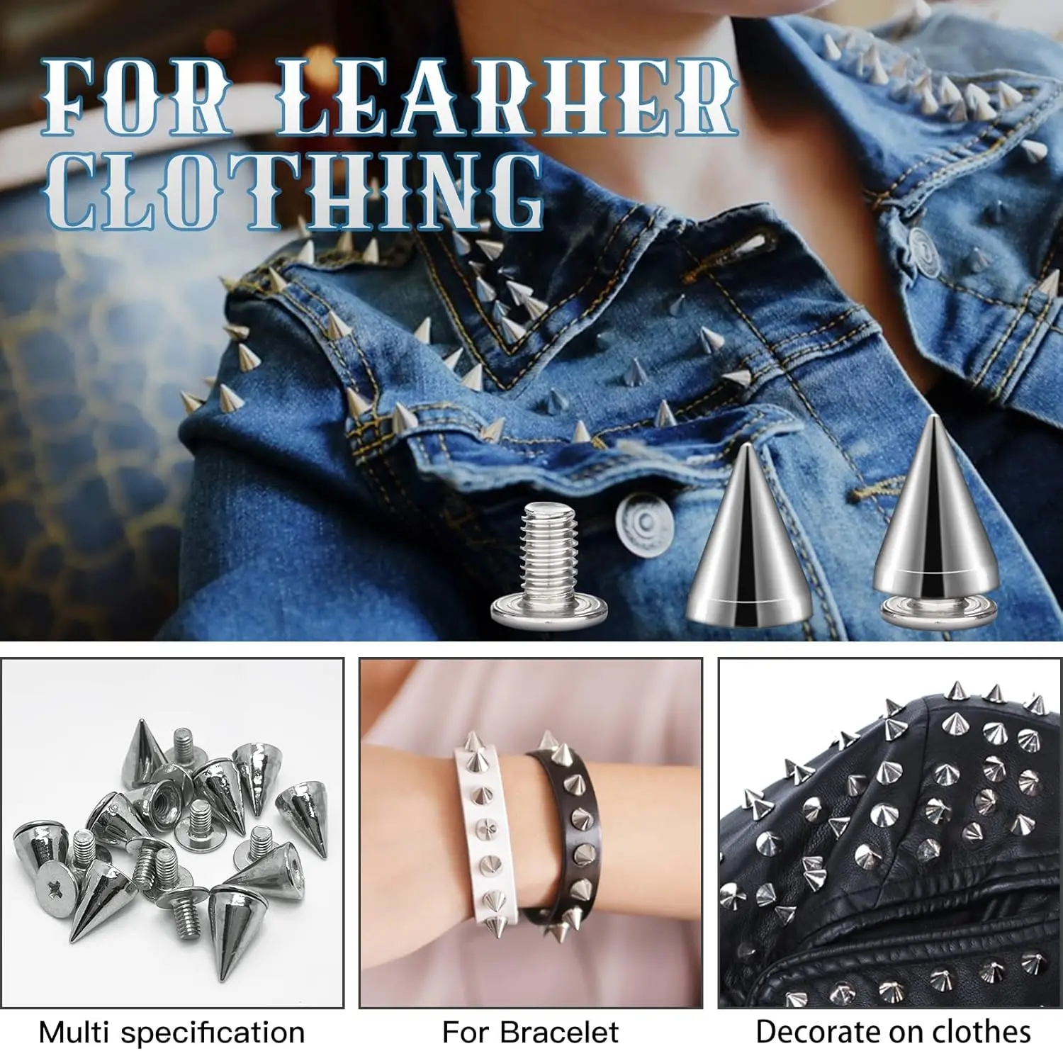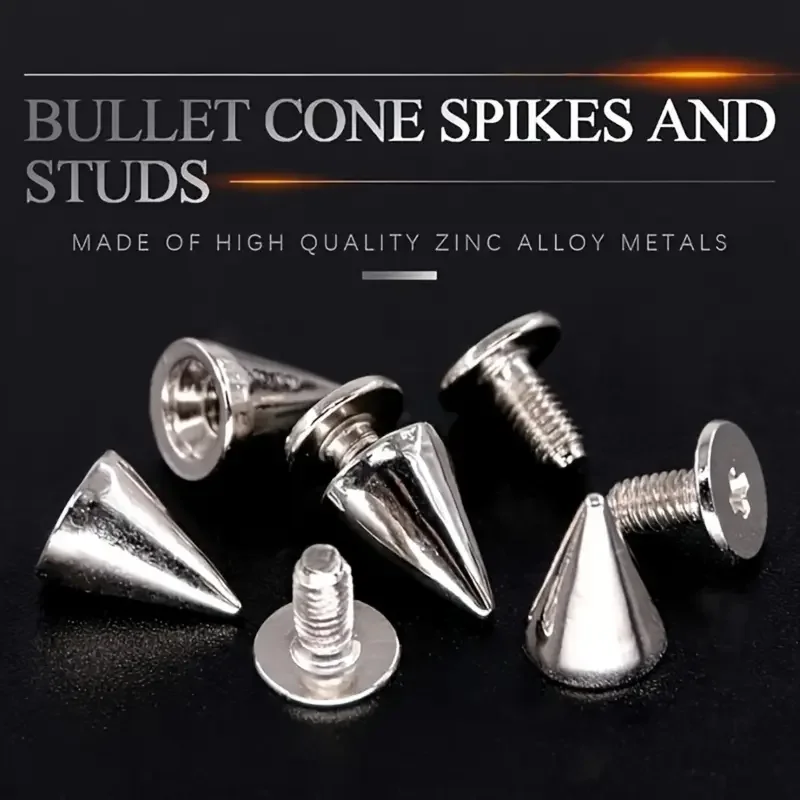Enhance your DIY projects with this set of Round Cone Spikes made from durable zinc alloy. These punk-style studs are perfect for adding a unique touch to shoes, clothing, bags, and other leather crafts. Available in various sizes and quantities, they are an essential tool for any crafting enthusiast.