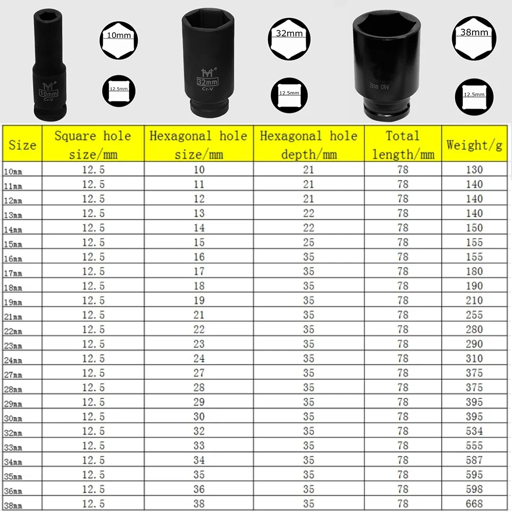 10-38mm 1/2 Inch Drive Deep Impact Sockets Metric Air Pneumatic Socket Wrench
