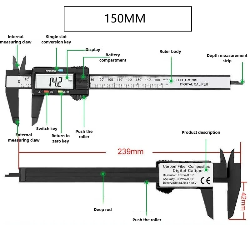 This 100/150mm Digital Caliper is a precise measuring tool designed for carpentry and various applications. It features a linear capacitive measuring system that allows for easy and accurate measurement of internal and external dimensions. The caliper includes a zero setting adjustment and a locking screw to secure the jaws in place, making it versatile for measuring length, width, interior diameter, and exterior diameter. The clear LCD display ensures quick reading of measurement results, and its lightweight design makes it easy to carry and store.