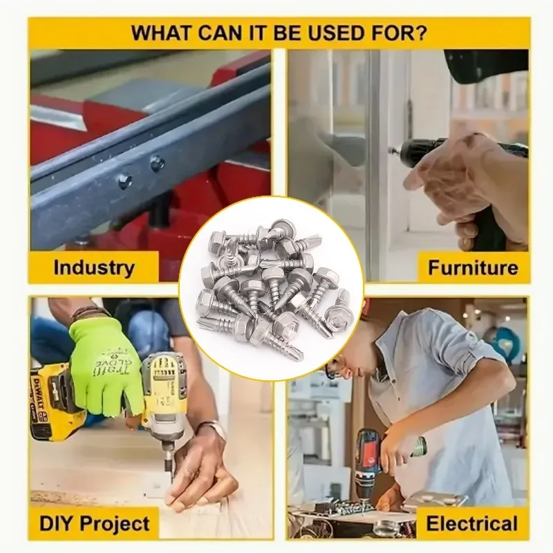 Introducing the 100/20x Self-tapping Screws, designed for various applications including sports equipment, communication devices, and home furnishings. These screws feature a hexagon washer head and a self-drilling point, making them ideal for quick and efficient fastening.