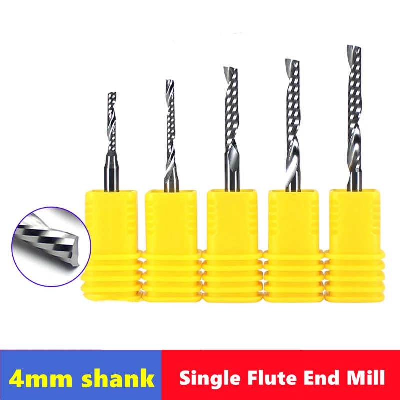 This set includes 10 pieces of 4mm shank carbide end mills with a single flute design, ideal for precision milling applications. The cutters are suitable for use with CNC routers and are designed to provide excellent performance in various materials.