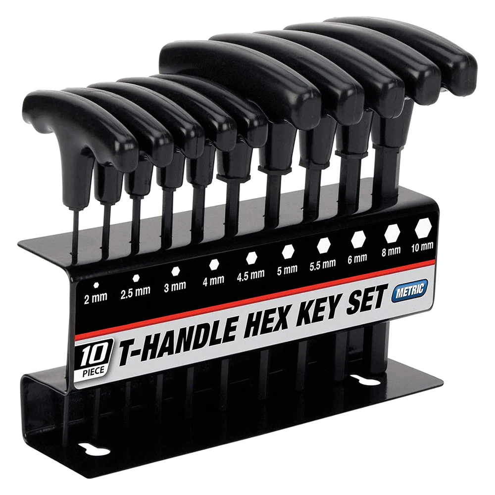 This versatile tool set includes 10 T-handle hex keys, designed for ease of use and efficient storage. Perfect for various applications, these tools are suitable for metal work and come in both metric and inch sizes.