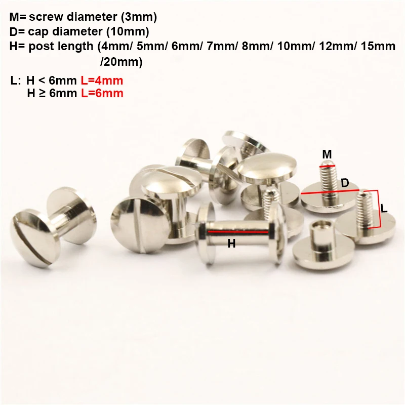 These 10 sets of Brass Binding Chicago Screws are perfect for various leather crafts, including photo albums, belts, and wallets. Each set includes screws that allow for easy assembly and disassembly, making them versatile for your crafting needs.