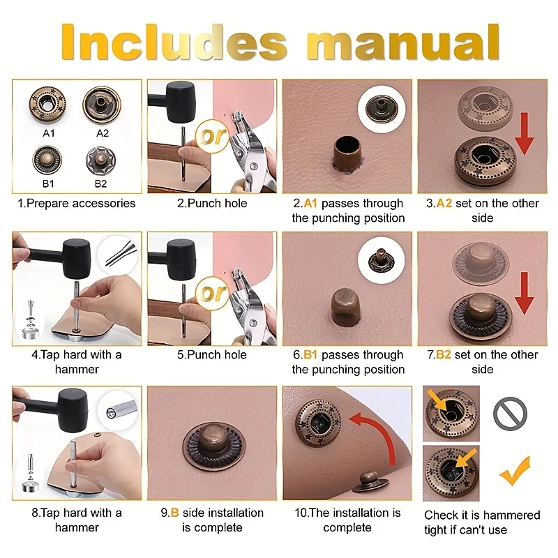 These double cap leather rivets are perfect for adding decorative elements to your clothing and shoes, as well as for repair purposes. The kit includes everything you need to easily apply the rivets, making it a great choice for DIY enthusiasts and professionals alike.