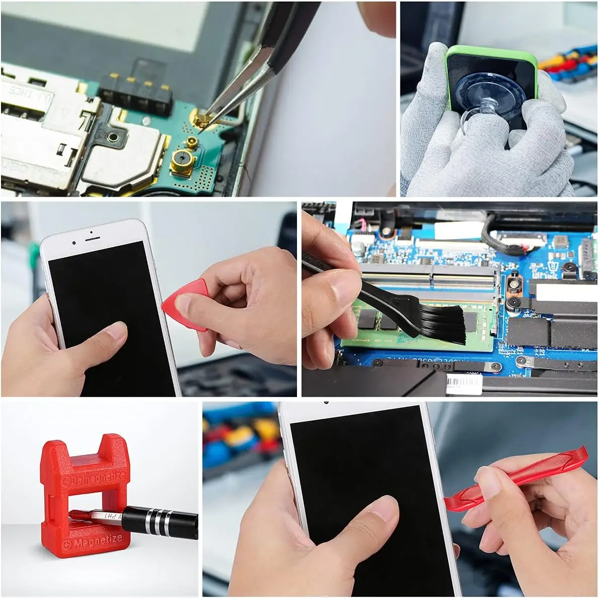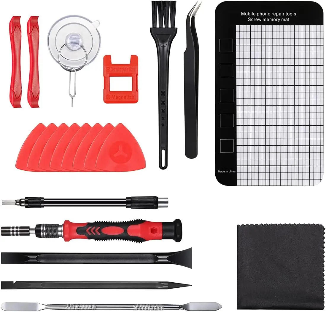 - 22 x Accessories including magnetizer, magnetic mat, ESD tweezers, suction cup, spudger, and cleaning brush.