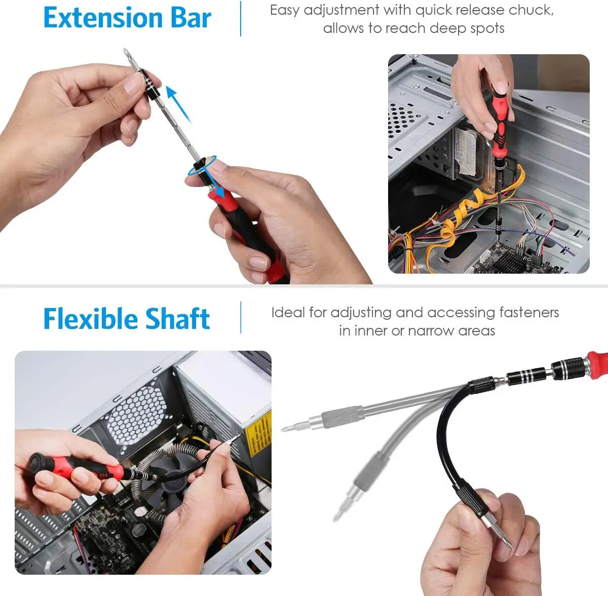 - Humanized Design: Features an ergonomic handle with a particle grip and a flexible extension shaft for hard-to-reach screws.