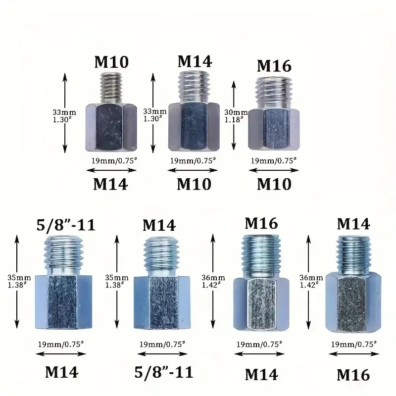 This versatile adapter allows you to connect various tools with different thread sizes. It enables M10 tools to fit M14 machines and vice versa, as well as accommodating M16 and 5/8-11 tools. Perfect for enhancing compatibility between your tools and machines.