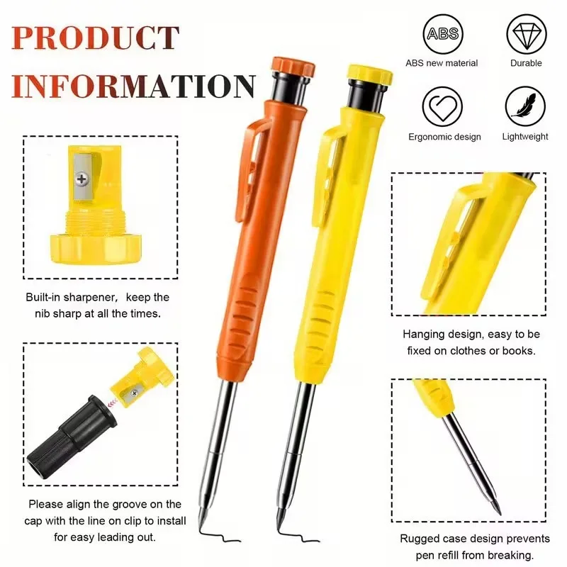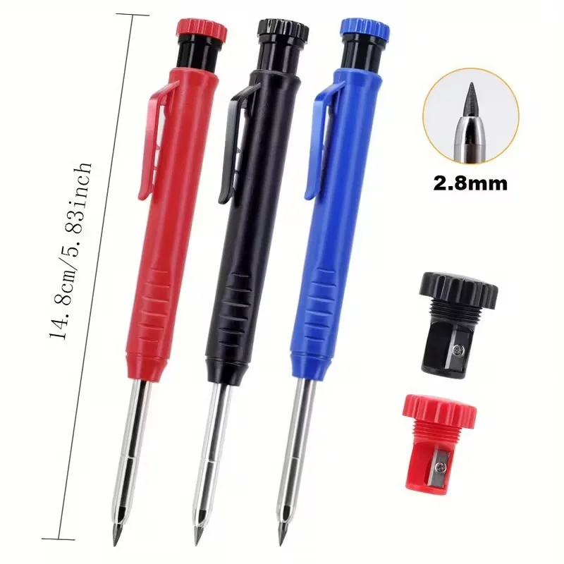 This 2.8mm Solid Carpenter Pencil Set includes mechanical pencils in three colors, designed for carpentry marking and woodworking tasks. Each pencil features a built-in sharpener for precise marking and is suitable for various surfaces including wood, metal, and glass.