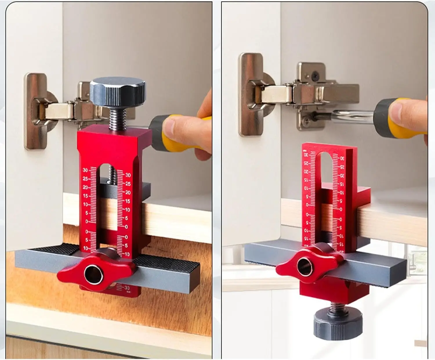 The 2-in-1 Cabinet Door Installation Locator is a multifunctional tool designed to assist in the precise installation of cabinet doors. Made from high-quality aluminum, this heavy-duty jig ensures durability and reliability for both professional and DIY woodworking projects.