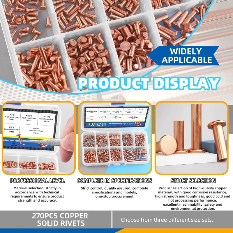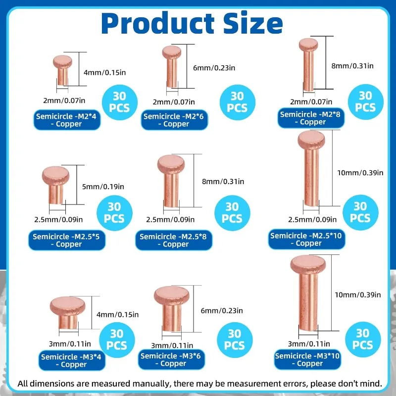 270Pcs Flat Round Head Metal Solid Rivets Self Plugging Copper Fasteners