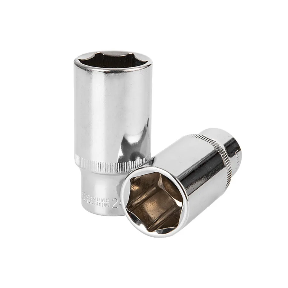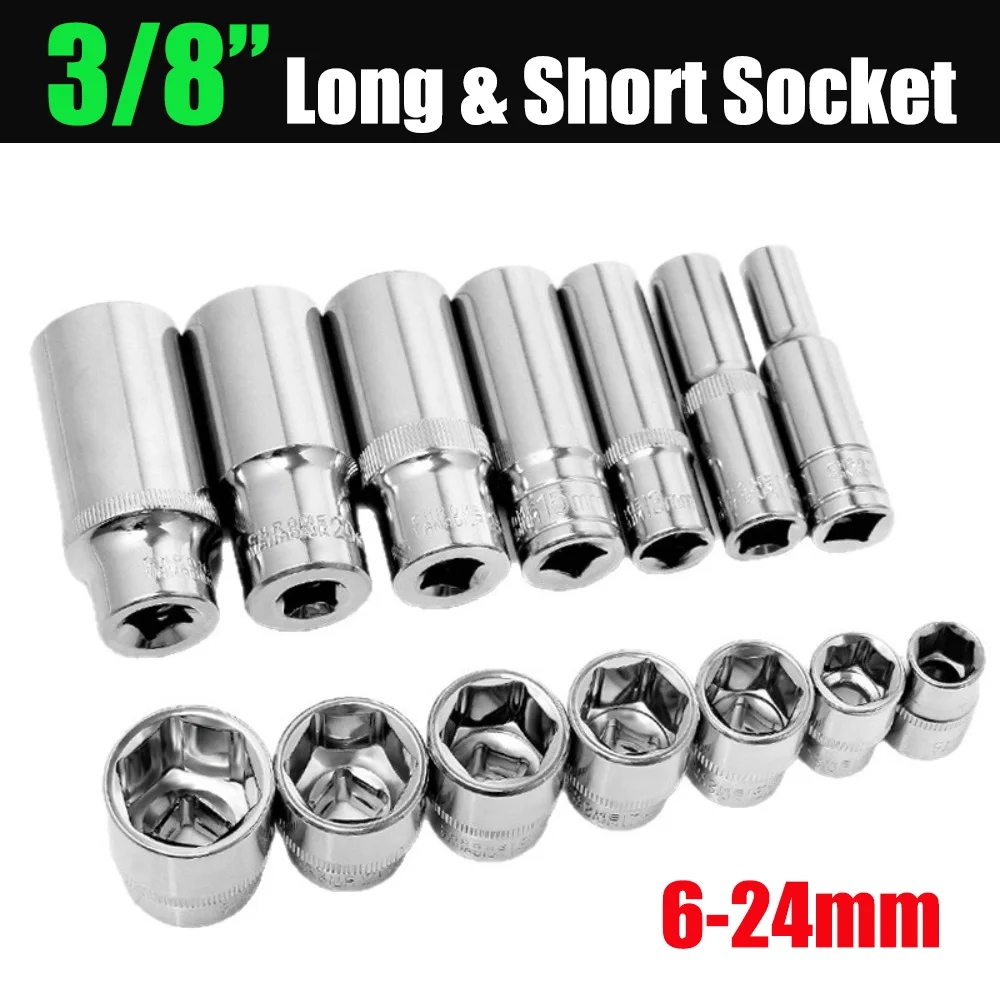 Introducing the 3/8 inch Short Long Socket Set, designed for use with torque ratchet socket wrenches. This comprehensive set includes deep socket adapters ranging from 6mm to 24mm, crafted from durable chrome vanadium steel for enhanced strength and longevity.
