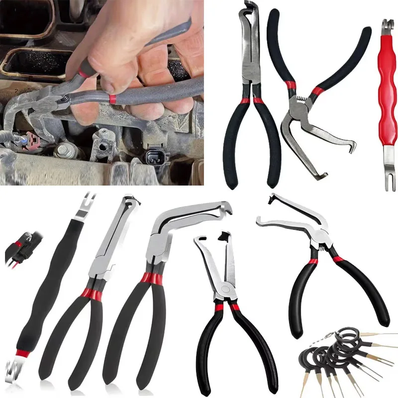 This 3-piece pliers set is designed for electrical connector disconnection, fuel line separation, and spark plug removal. Made from durable carbon steel, these tools are essential for automotive and electrical repairs.
