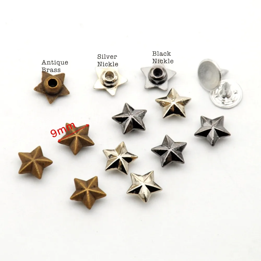 Introducing our 300 sets of 9mm zinc alloy metal rivets, designed for DIY projects. These star-shaped jeans button rivets come with aluminum nails and are available in three colors: nickel, black, and bronze.