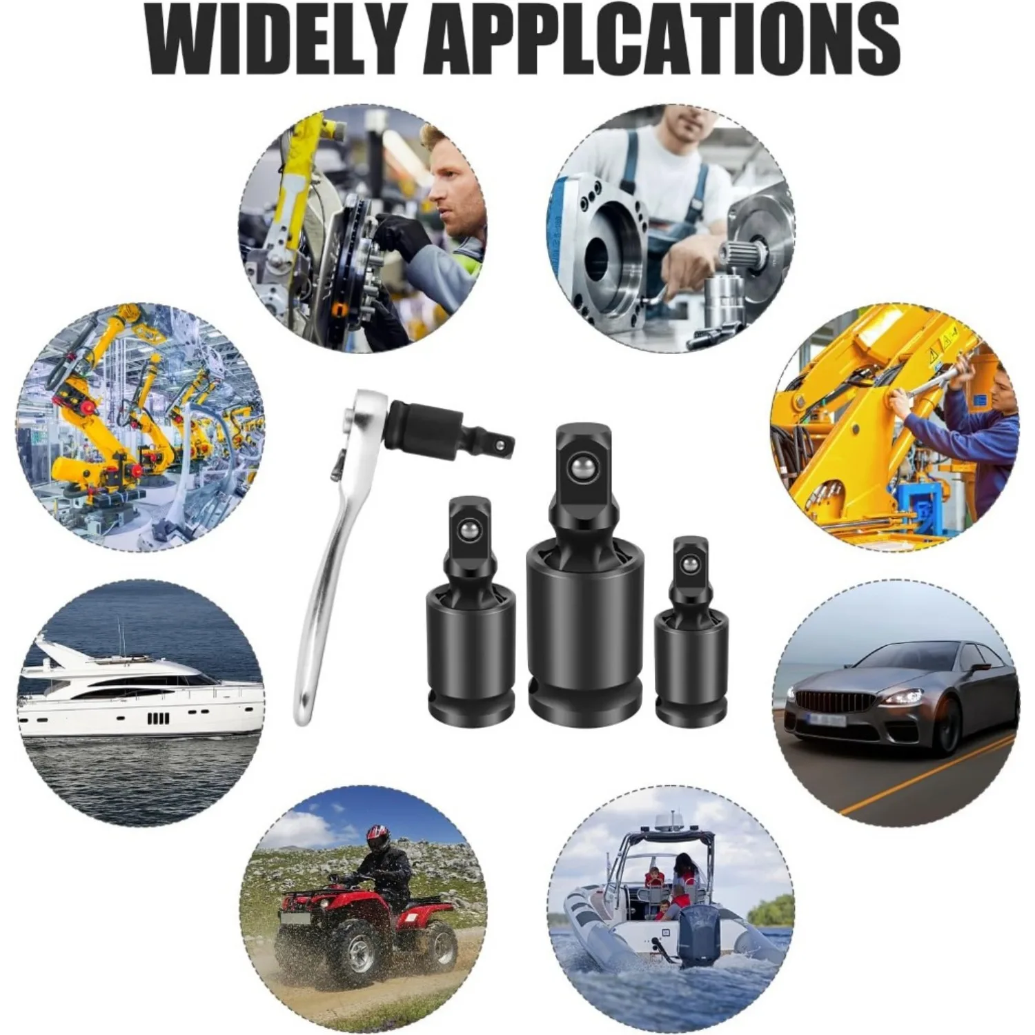 This 360° Impact Universal Joint-Socket Set is designed for versatility and efficiency in various mechanical tasks. It features a swivel knuckle joint that allows for full rotation, making it ideal for tight spaces and intricate repairs.