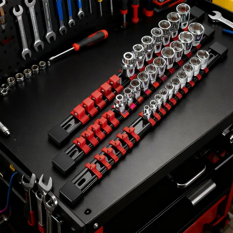 The 360° Swivel Socket Organizer is designed to keep your socket tools neatly stored and easily accessible. This versatile tool holder features a sliding stand that allows for quick organization and retrieval of your sockets.