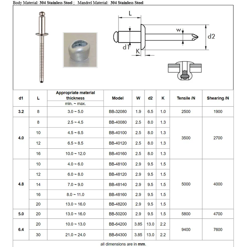 These stainless steel dome head blind rivets are made from high-quality 304 stainless steel, ensuring durability and resistance to corrosion. They are designed for various applications, providing a secure fastening solution in different environments.