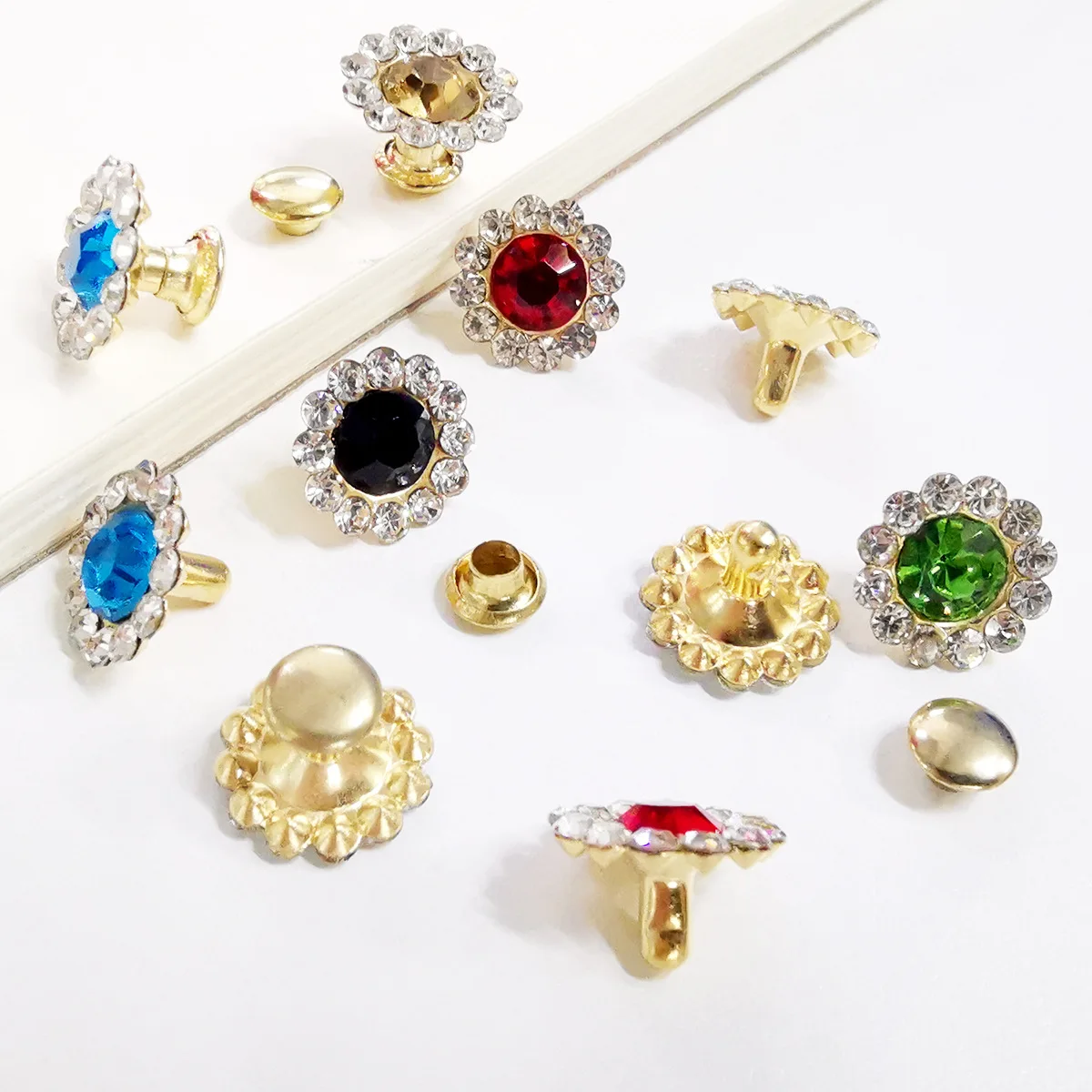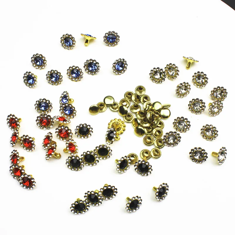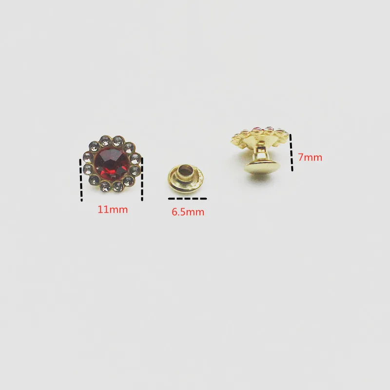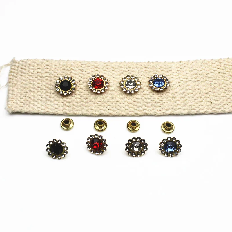 Introducing the Diamond-studded Plastic Sunflower Studs, available in sets of 50 or 100. These decorative rivets are perfect for adding a punk flair to your leather goods and clothing. Each stud measures approximately 11mm in diameter and comes in a variety of colors including silver, red, black, and blue.