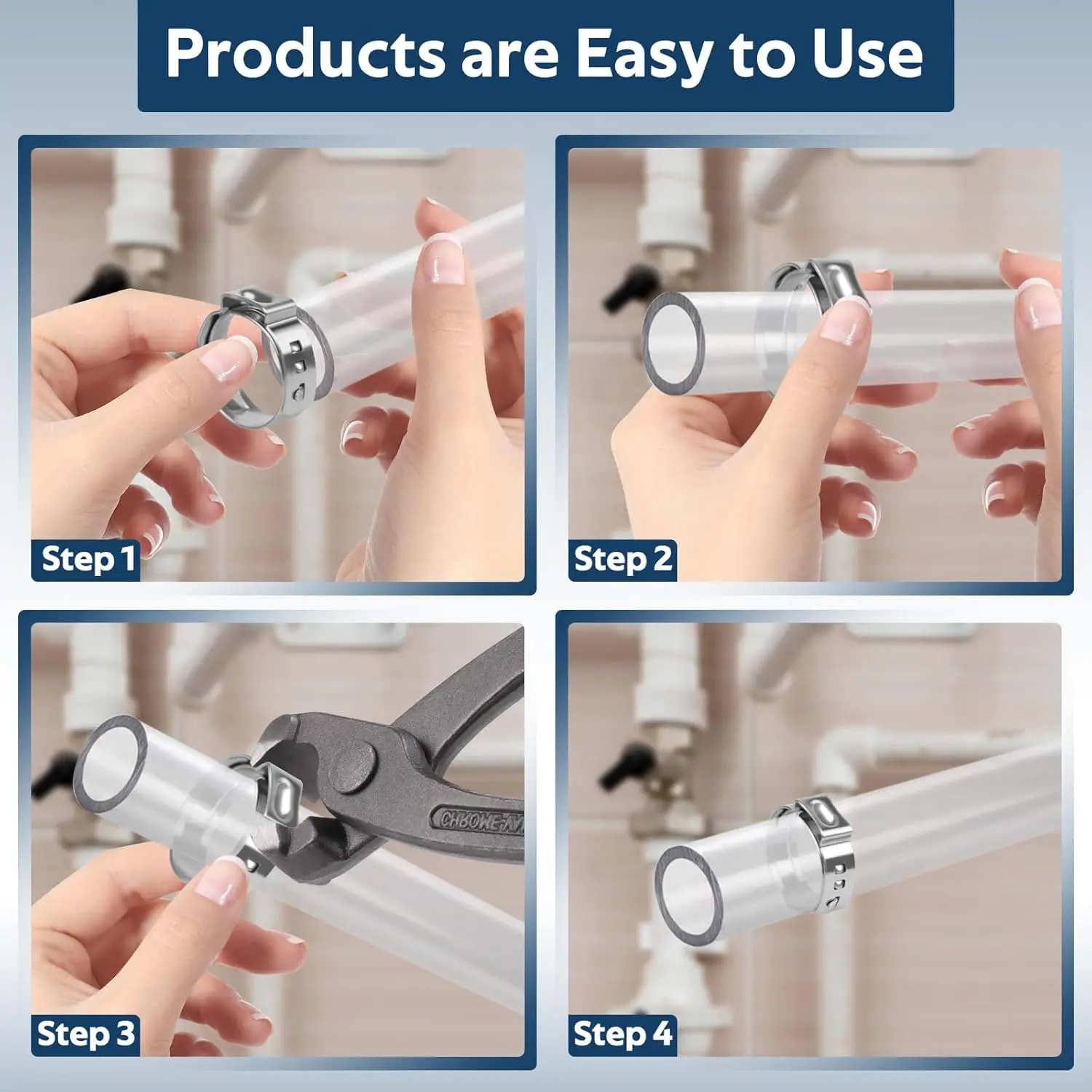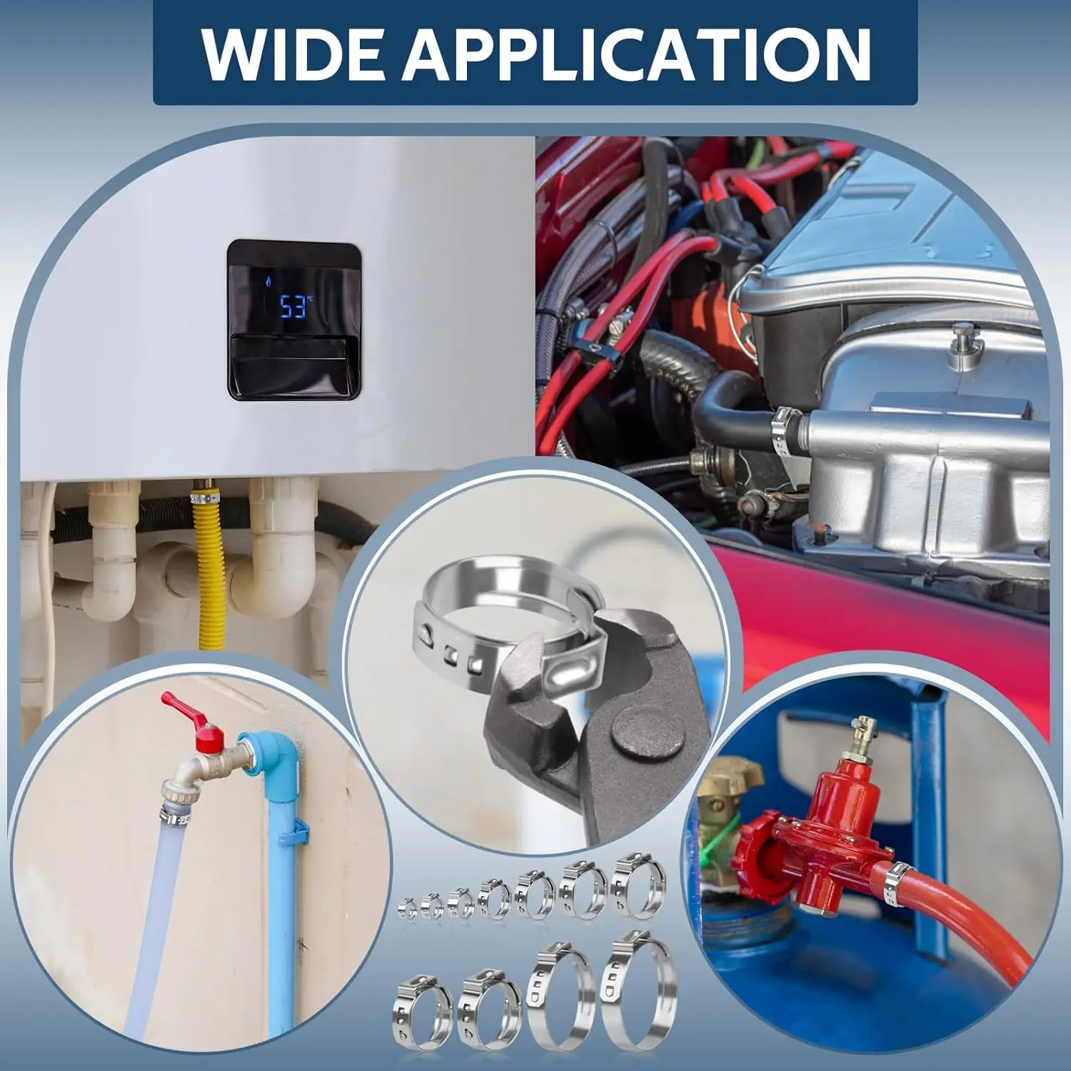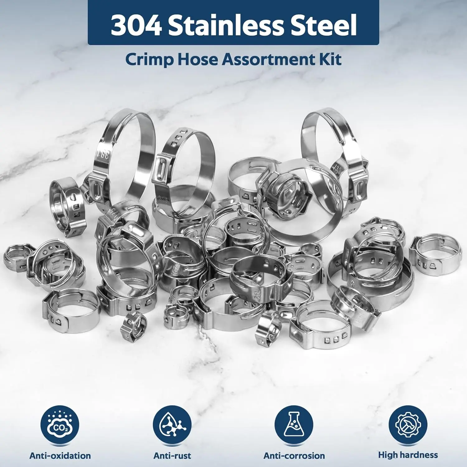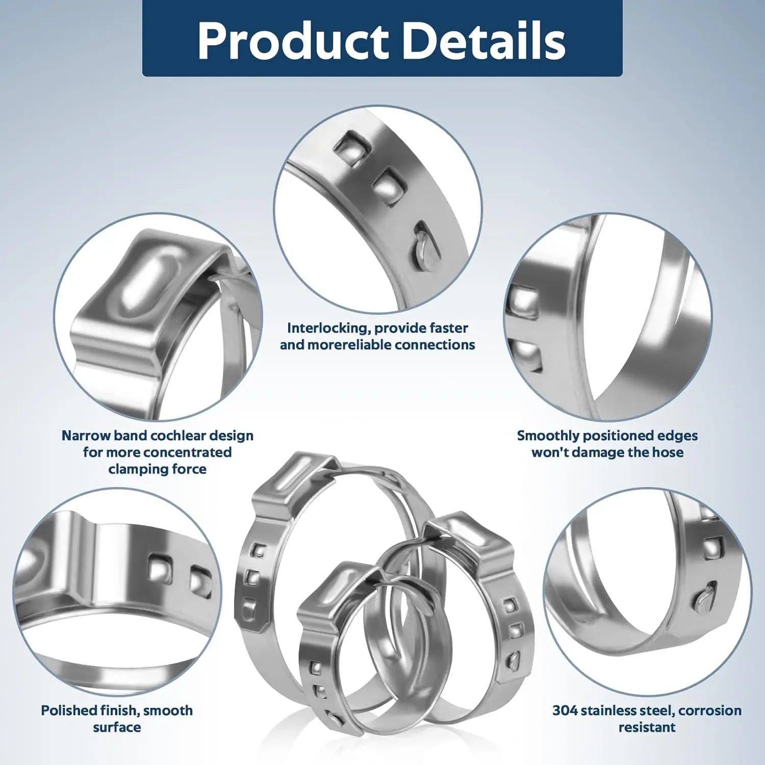 This product is a set of 50 single ear stepless clamps designed for connecting hoses and hard pipes. Made from high-quality 304 stainless steel, these clamps are polished for a smooth finish, ensuring minimal damage to hose surfaces.