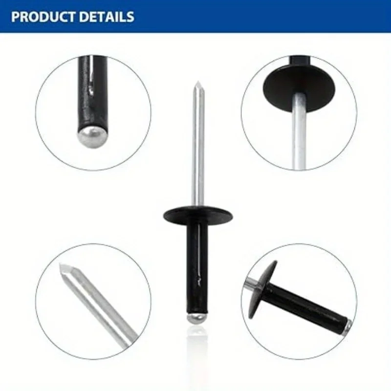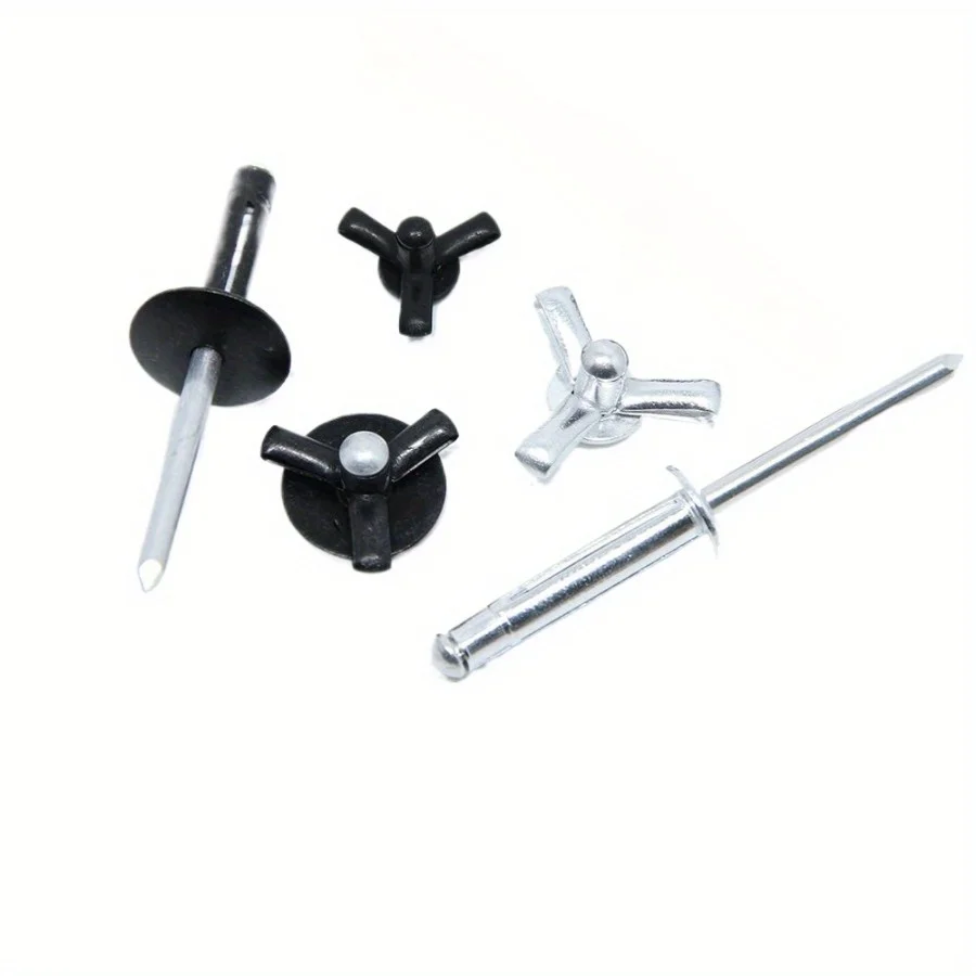 This package contains 50 pieces of black painted aluminium trifold blind rivets, designed for various DIY projects and automotive applications. These rivets feature a large flange that helps distribute load effectively, making them ideal for use in brittle and soft materials.