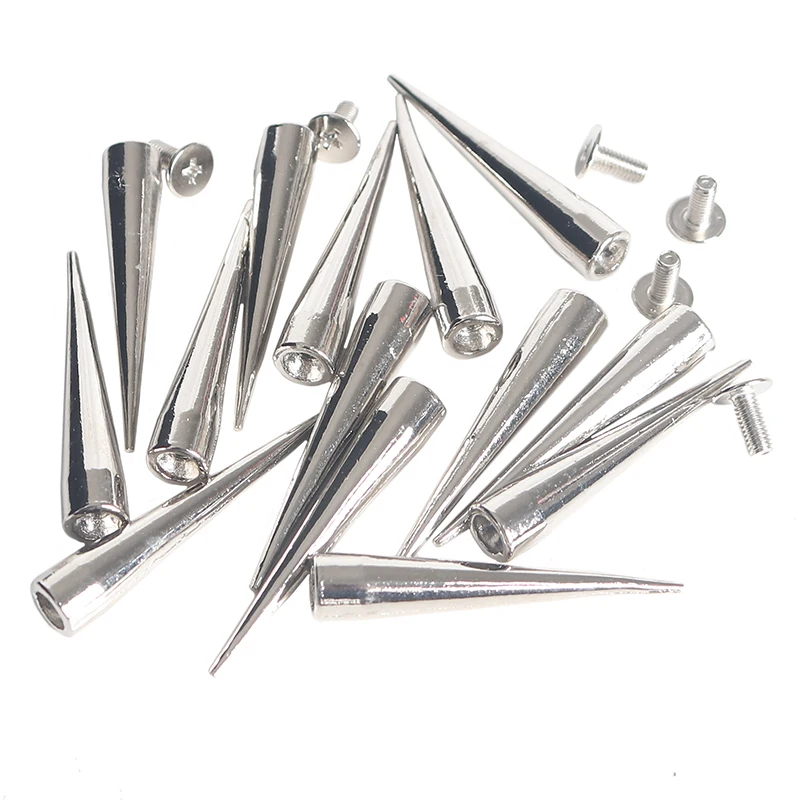 These spikes are suitable for various applications including leather bracelets, dog collars, bags, clothes, shoes, and belts. They can be easily attached to most materials like leather and denim by fastening the spike to the screw.