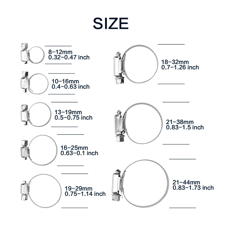 This Stainless Steel Hose Clamp Assortment Kit includes 54-73 pieces of adjustable clamps suitable for various plumbing applications. The clamps range in size from approximately 1/4” to 1-3/4” (6-44mm), making them versatile for different pipe diameters.