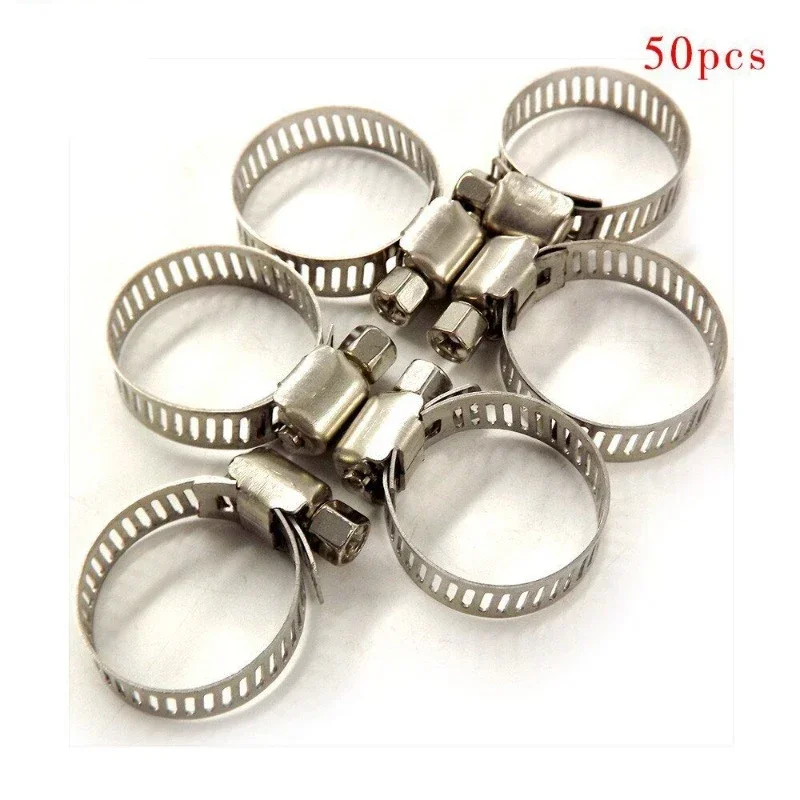 These hose clamps are designed for securing hoses in various applications. They are adjustable and made from durable stainless steel, ensuring a strong hold and resistance to corrosion.