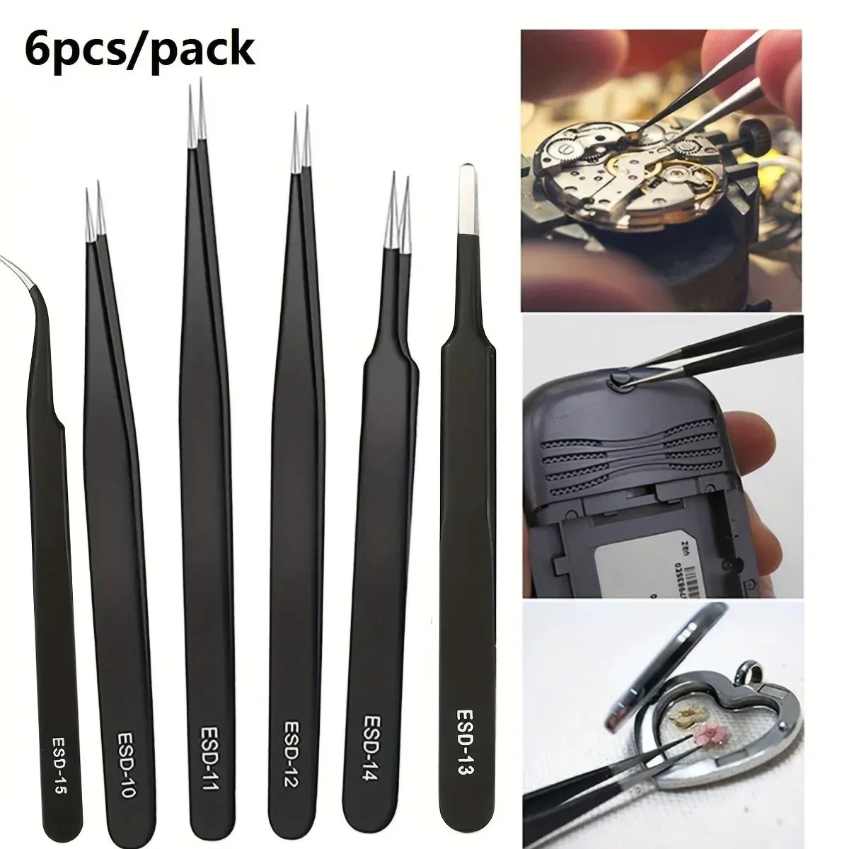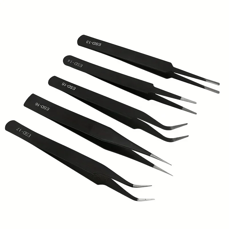 This set includes 6 pieces of precision anti-static stainless steel tweezers, designed for industrial maintenance and household model making. These tools are perfect for detailed work requiring precision and care.