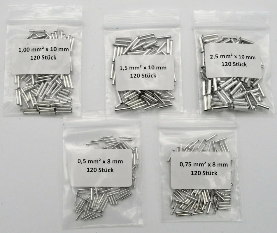 This assortment includes 600 pieces of tube-type bare terminal combination wire end ferrules in various sizes, suitable for different wiring needs.