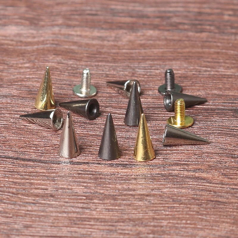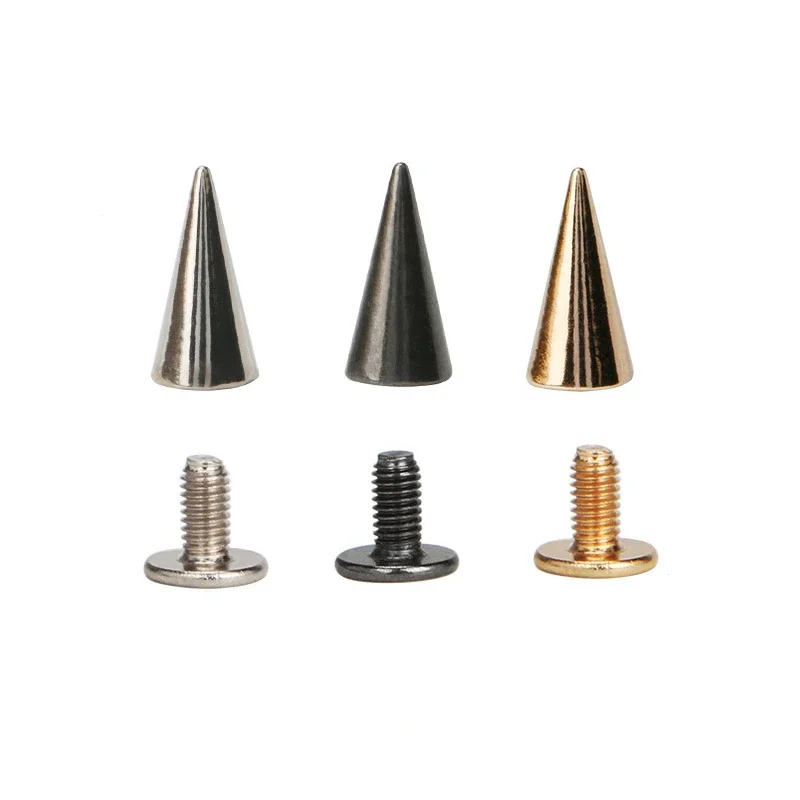 These 6*12mm Punk Spike Cone Spots are perfect for adding a bold touch to your leathercraft projects. Each set includes 100 metal studs that can be used on various items such as clothes, bags, belts, and pet collars.