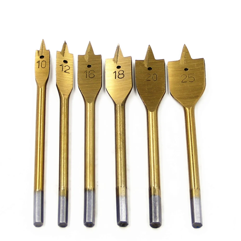 This set includes 6 hexagonal handle titanium plated flat drills, designed for woodworking applications. The drills range in size from 10mm to 25mm, making them versatile for various drilling tasks.