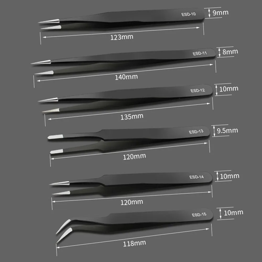 Introducing the 6pcs Anti-Static Stainless Steel Tweezers, designed for precision maintenance and industrial repair. These tweezers are perfect for model making and handling electronic components safely.