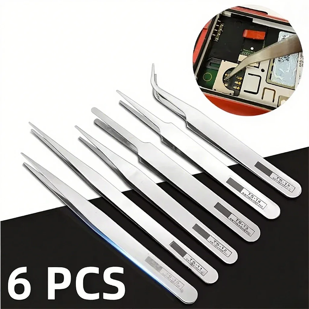 6pcs Tweezers Professional Watch Repair Tool Stainless Steel Curved Straight