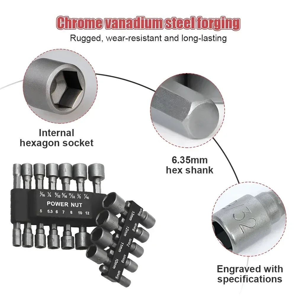 This set includes 9 or 14 pieces of hex socket screw sleeve nozzles and nut driver bits, designed for various screw tightening applications. Made from durable chrome vanadium steel, these tools are built to last and resist wear, making them ideal for both professional and home use.