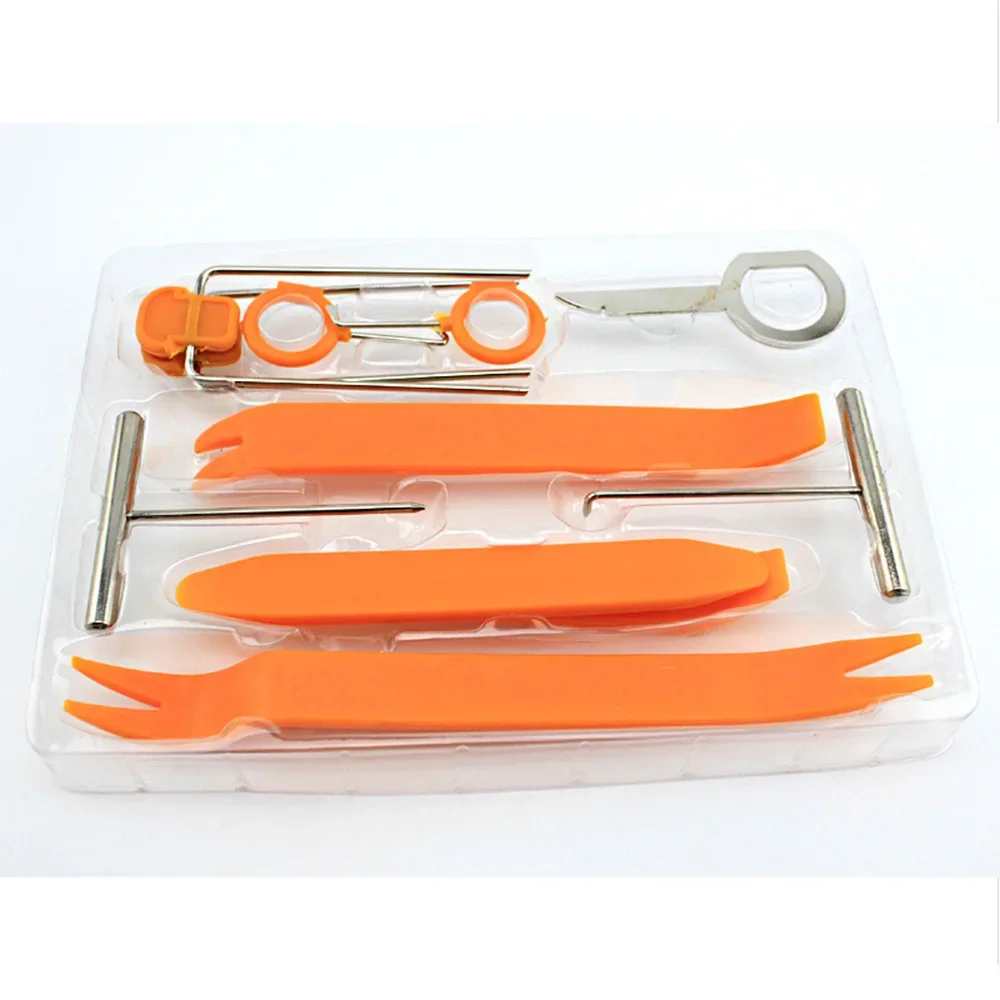 This Auto Interior Trim Removal Tool Set is designed for easy disassembly of plastic fasteners on door panels of most automobiles and trucks. The tools are made from durable plastic and are perfect for car audio disassembly without scratching the surfaces.