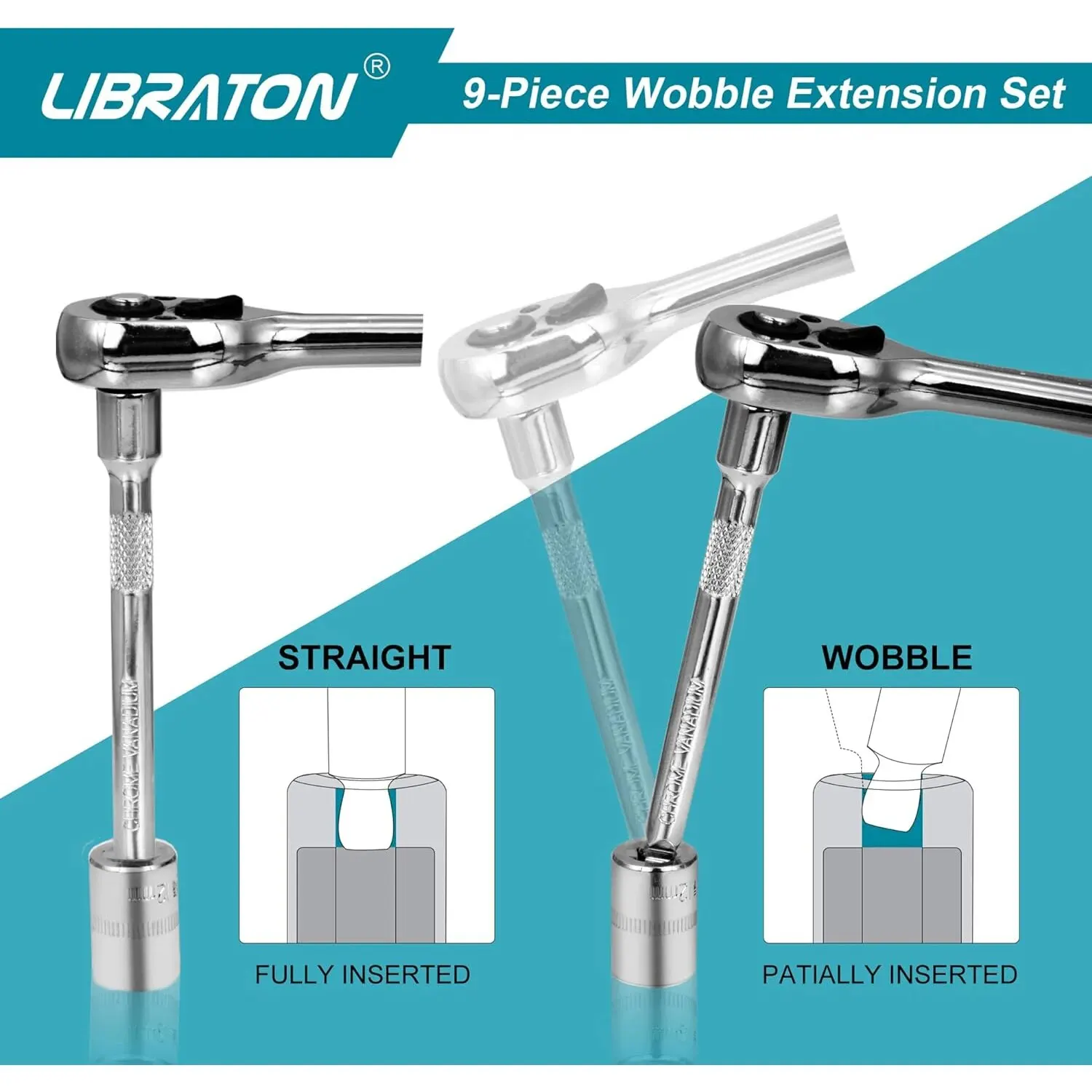 The Libraton Wobble Extension Set is a versatile socket extension set designed for use with ratchets. It includes various sizes of wobble extensions that allow for easy access to hard-to-reach fasteners.