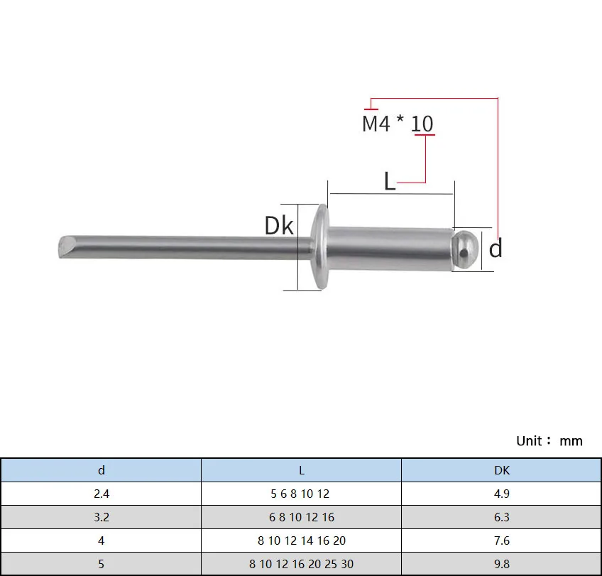 - Rivet length: Various lengths available, such as 5mm, 6mm, 8mm, 10mm, 12mm, and 14mm.