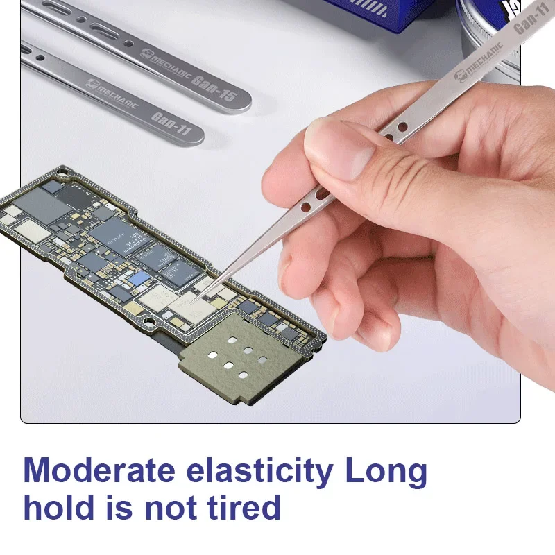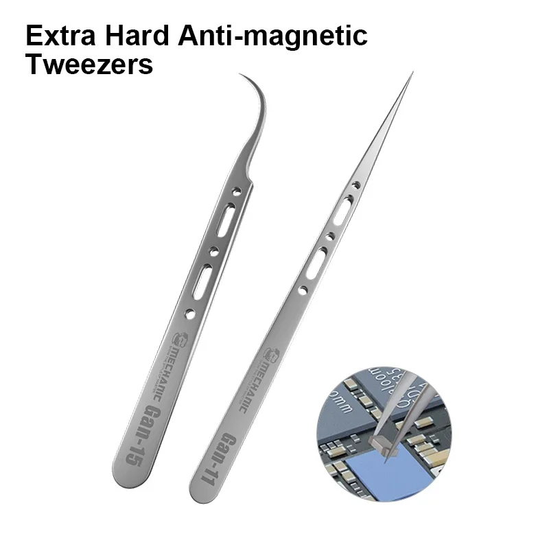Introducing the Mechanic GAN 11 GAN 15 Extra Hard Anti-magnetic Tweezers, designed for precision and durability in various repair tasks. These tweezers feature a high hardness tip that ensures a firm grip, making them ideal for handling small components with accuracy.
