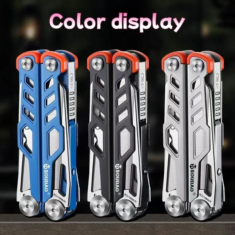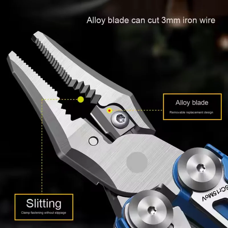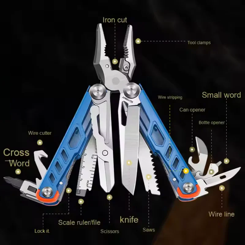 Multi-functional tool pliers designed for outdoor activities such as camping and hiking. These folding pliers are made from durable stainless steel, making them an essential emergency combination tool for various tasks.