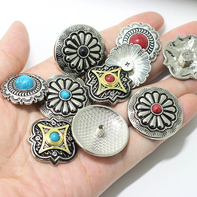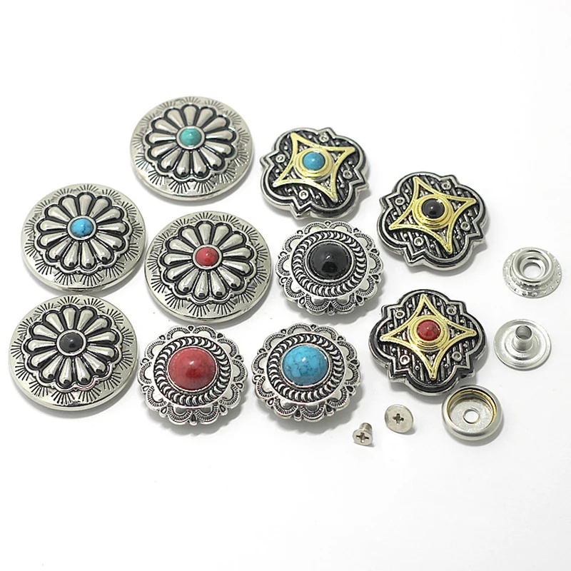 30mm Plated Brass Sun Flower Carved Green Turquoise Leathercraft Conchos