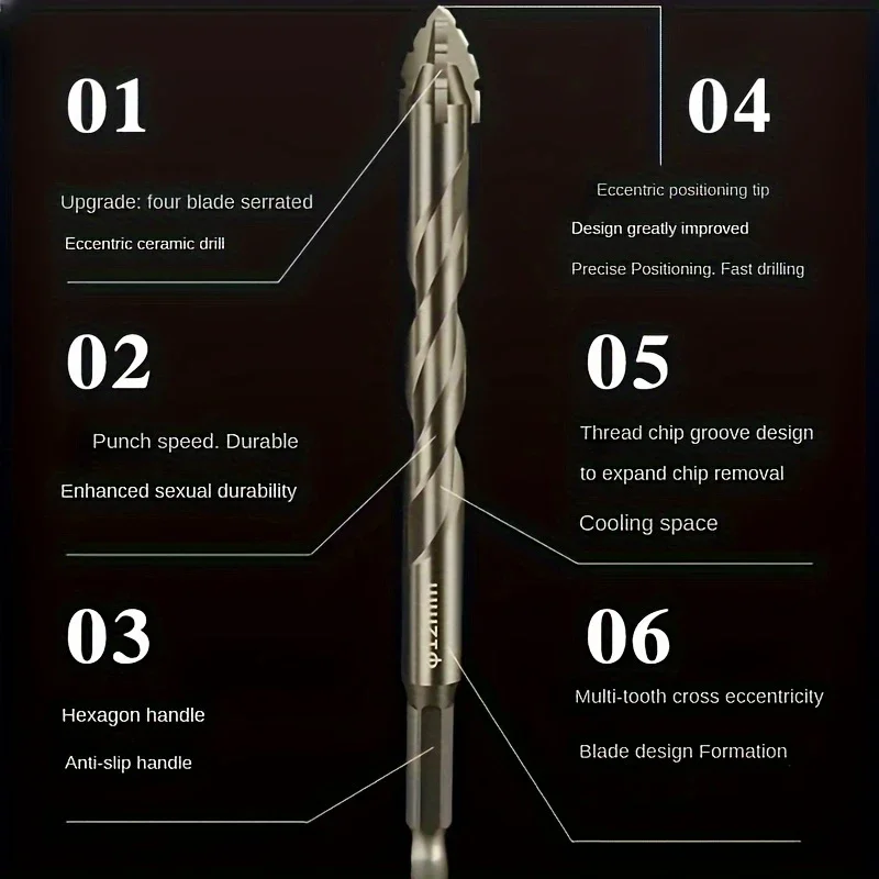 Upgraded four-edged sawtooth drill bit set designed for efficient drilling in tile, glass, concrete, and metal. This set includes various sizes to meet your drilling needs, making it ideal for both professional and DIY projects.