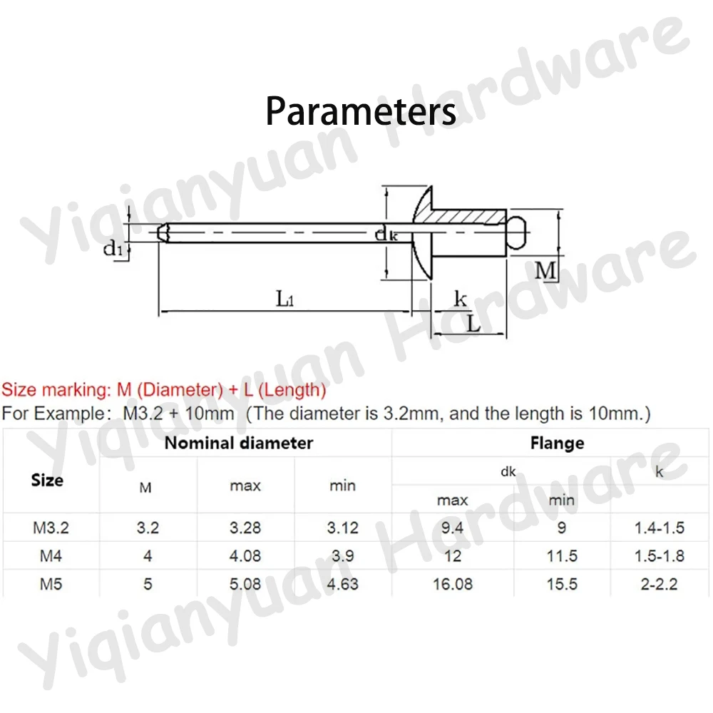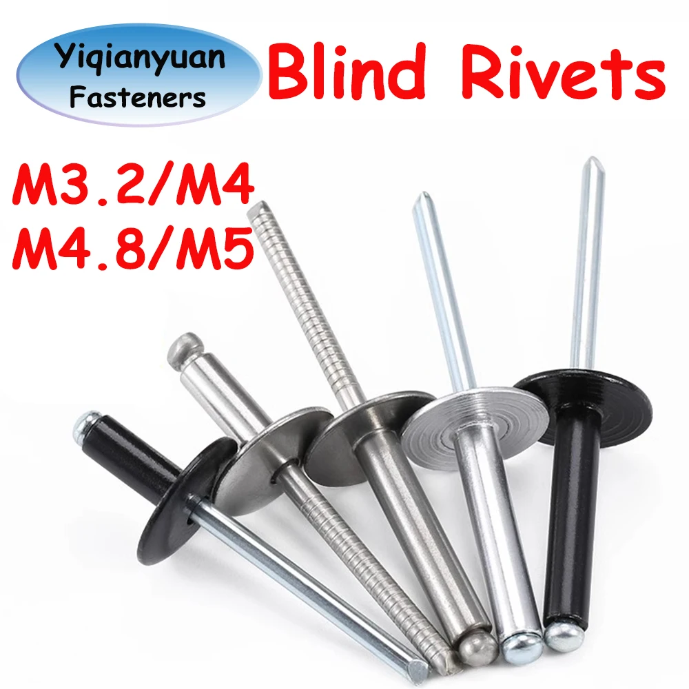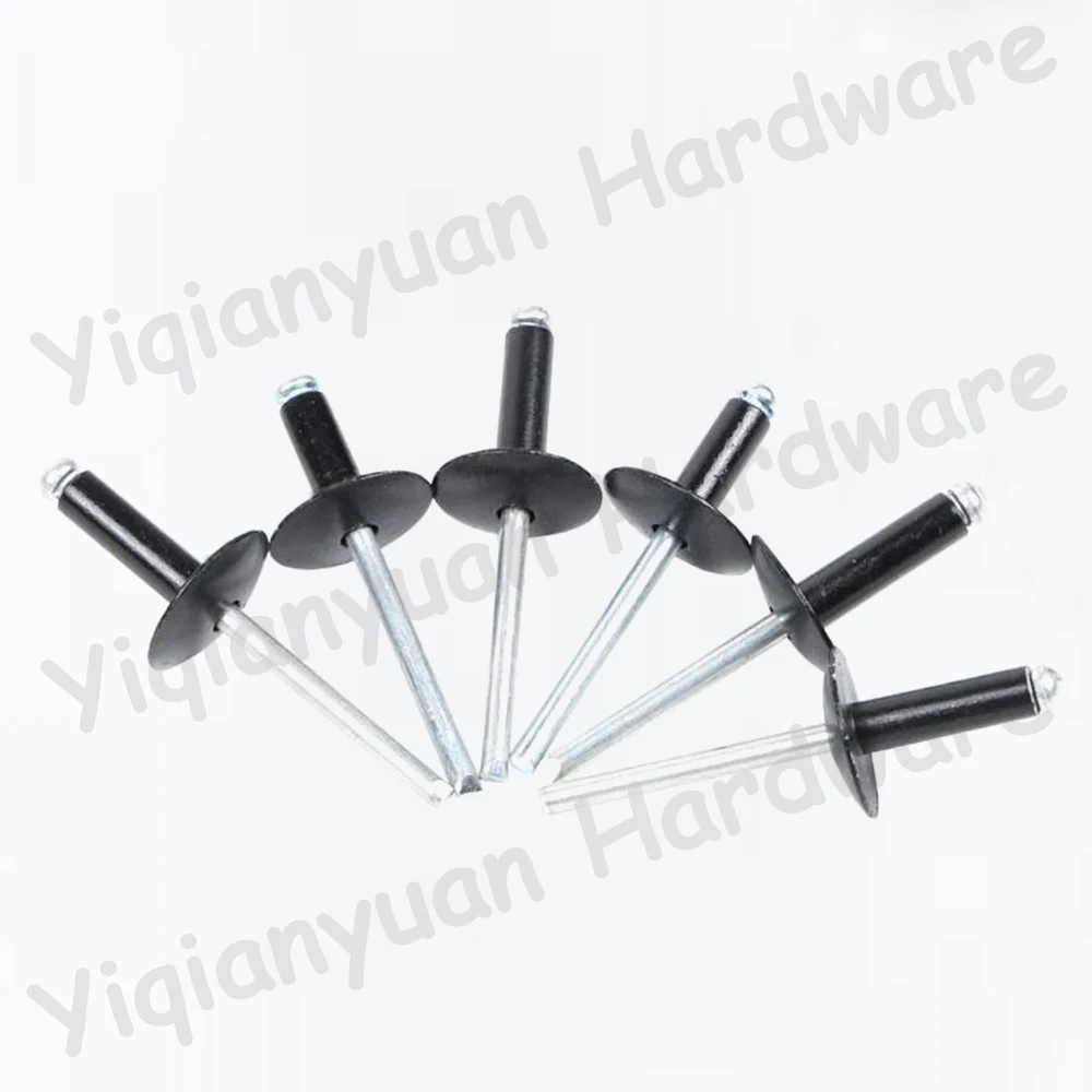 Yiqianyuan M3.2-M5 Aluminum Black/SUS304 Stainless Steel Pop Open End Large Flange Cap Blind Rivet Dome Head Self-plugging Rivet is designed for various metalworking applications. This product features a durable construction that ensures reliable performance in fastening tasks.
